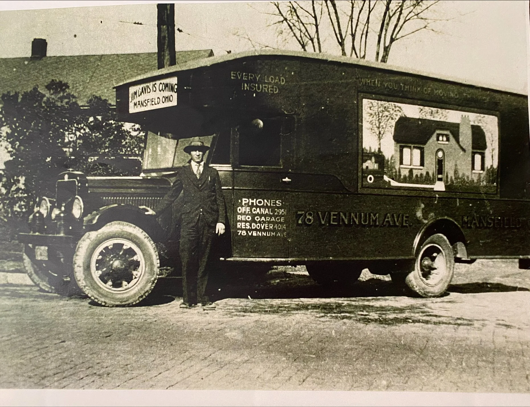 Jim Davis in 1929 standing next to his moving truck in Mansfield, OH
